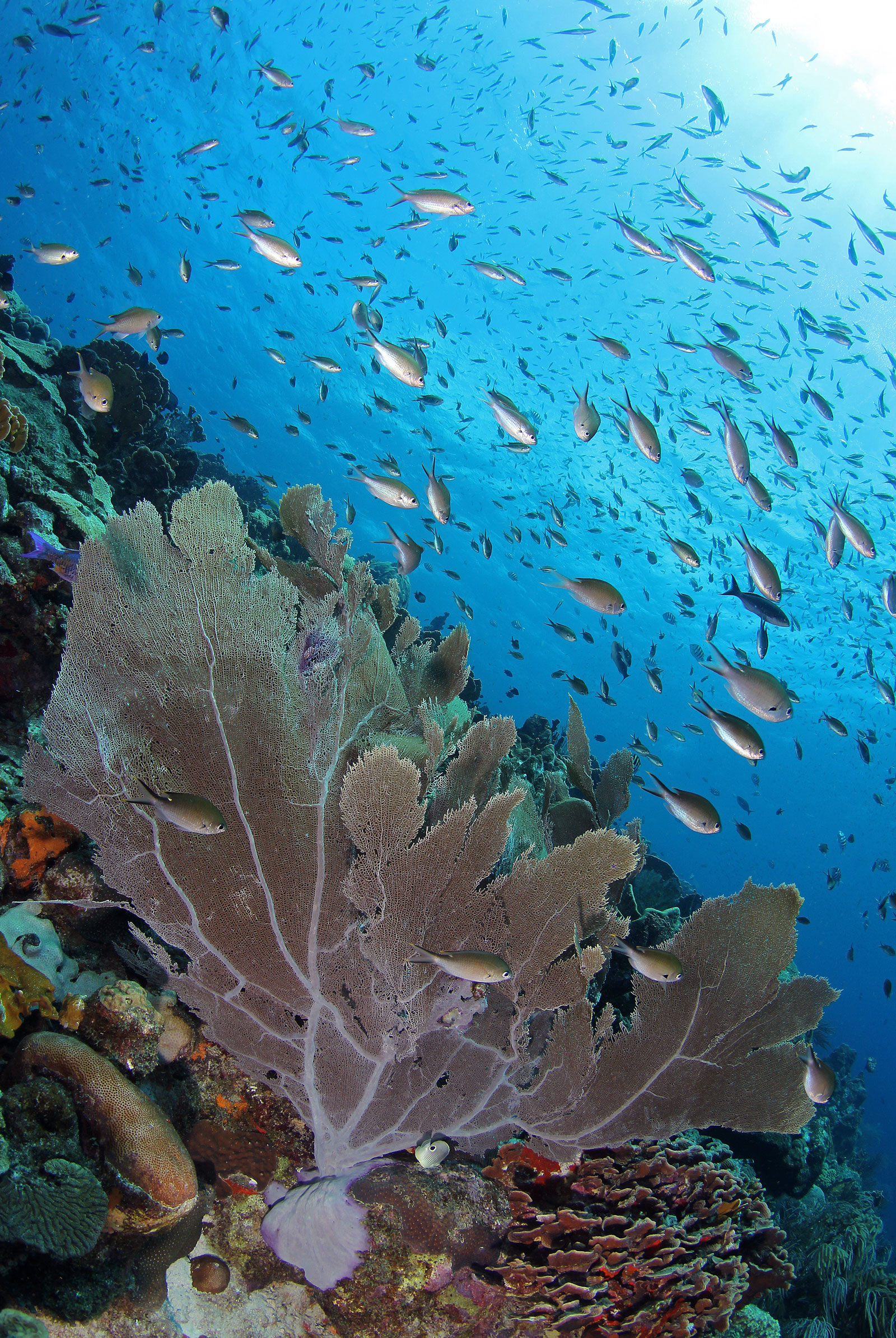 When you go diving here and you turn left after entering the water there will be a wall that starts at 10 meters (30ft) and goes all the way to 40 meters (130 ft). Once you reach the outermost part and start shallowing up you can start to see schools of fish in all shapes and sizes and corals of